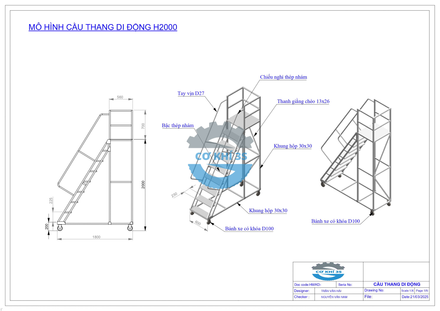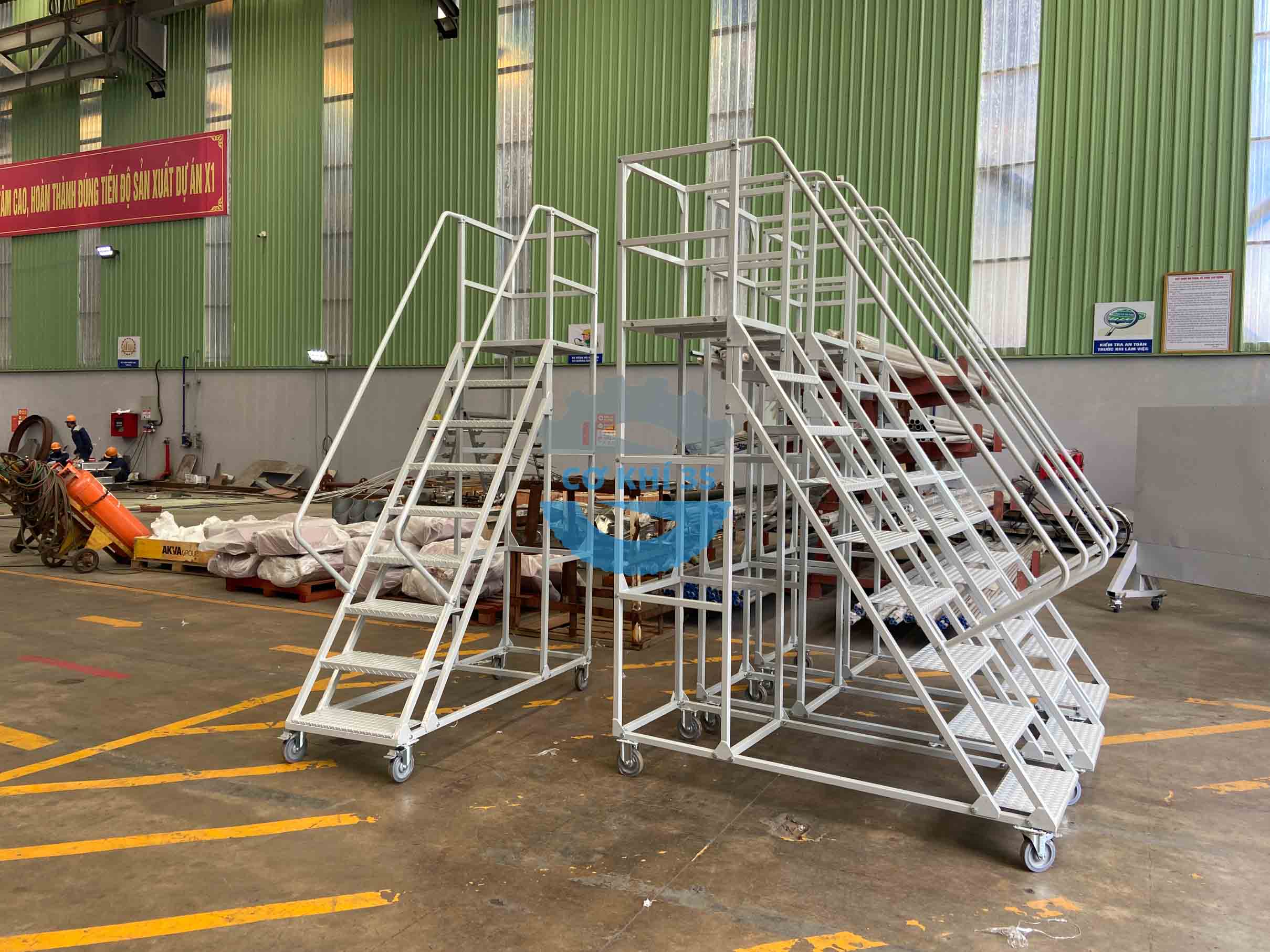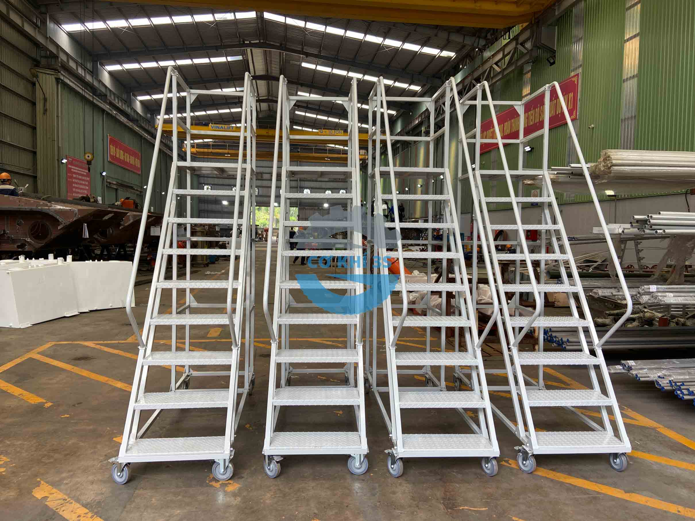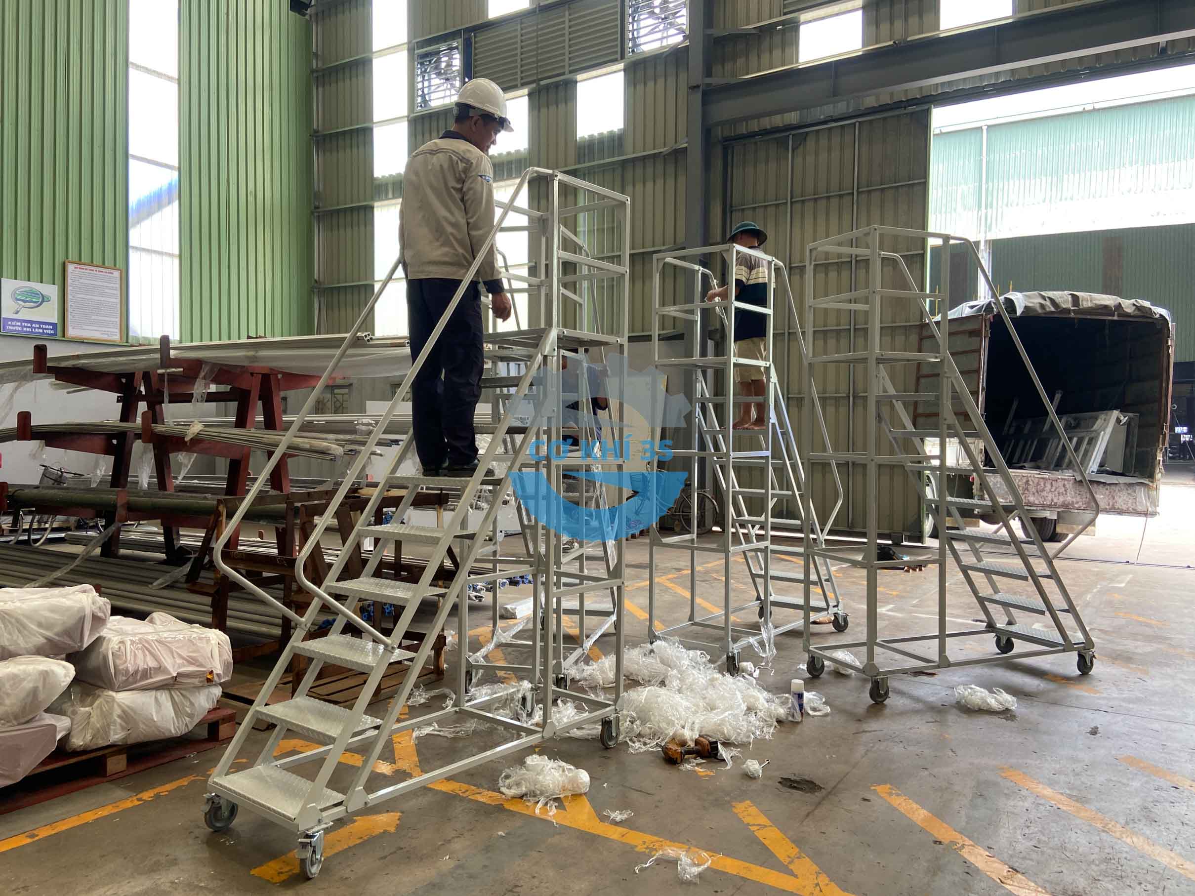 Cokhi3s là đơn vị sản xuất giá kệ chứa hàng và các vật tư công nghiệp cho các nhà máy, doanh nghiệp kho vận, sản phẩm xe thang di động cao 2000mm là bộ phận thuộc thiết bị nhà kho hoặc sử dụng cho các mục đich thao tác khác. Một số tên gọi phổ biến trên thị trường , xe thang di động (mobile ladder truck) hoặc thang kho có bánh xe (warehouse ladder with wheels) đều mang ý nghĩa về thang lấy hàng di động có bánh xe như nhau.