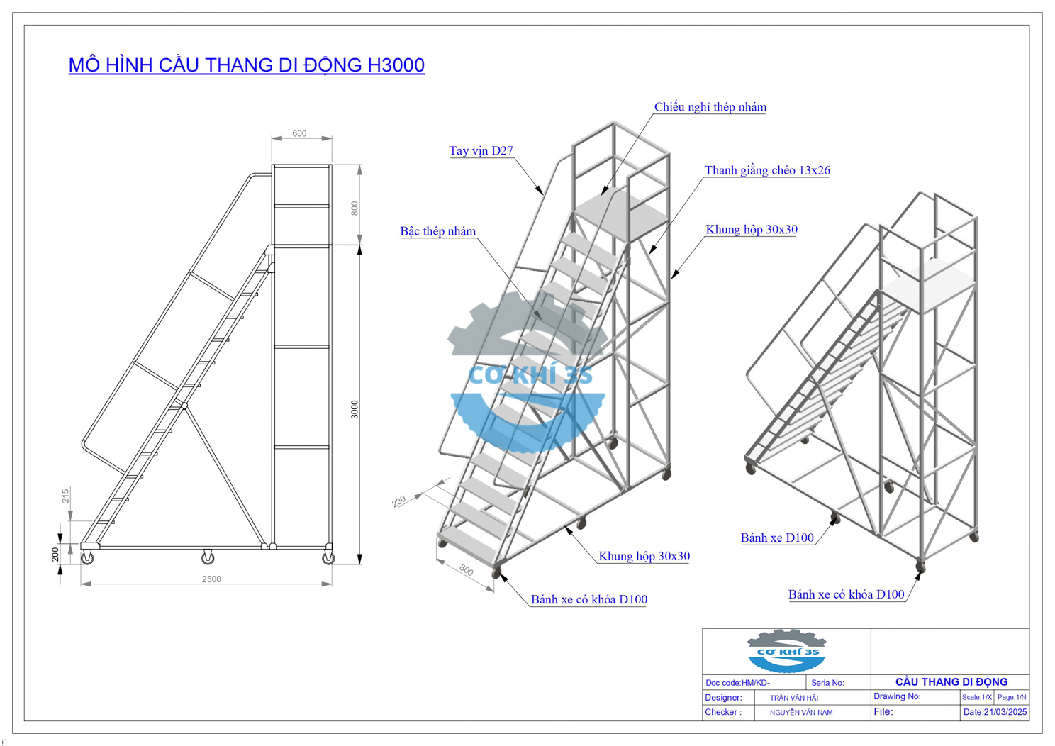 • Kích thước xe thang di động lấy hàng cao 3000mm : D2500 x R800 x C3000(+800 lan can) mm