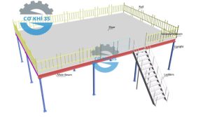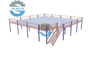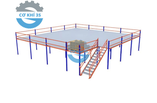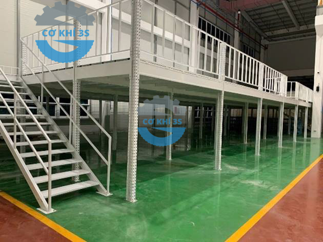 Kết cấu: Sử dụng chân trụ omega chịu lực cao, mặt sàn tôn gân hoặc ván công nghiệp, có cầu thang di chuyển.