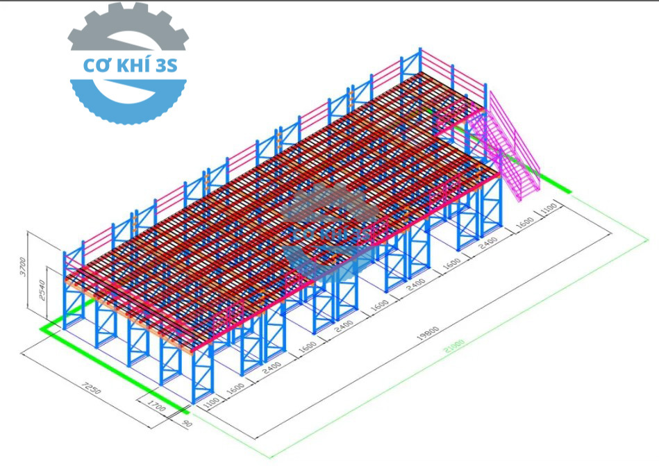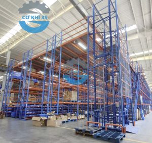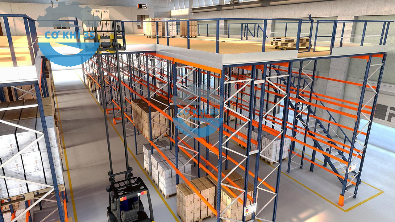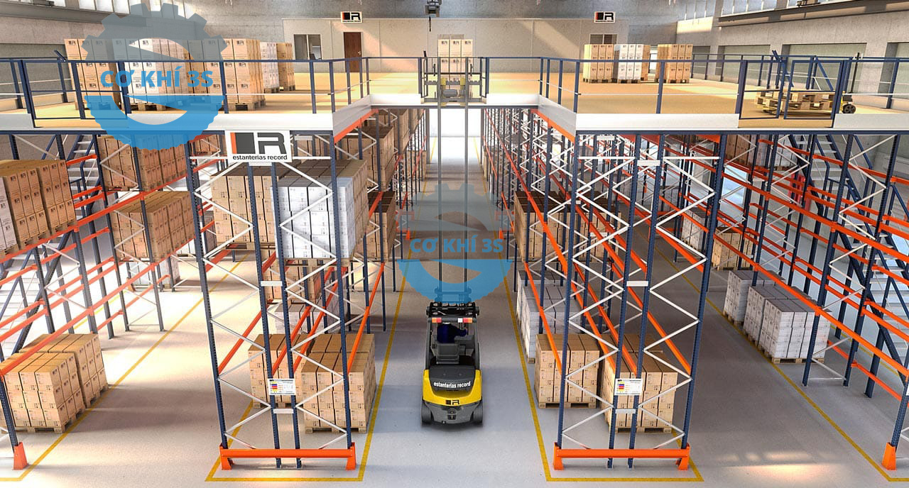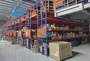 Kệ selective bên dưới để pallet và các lối đi cho xe nâng từ 3-4m được tận dụng câu dầm bên trên đỉnh cột và làm thành sàn gác lửng bên dưới.